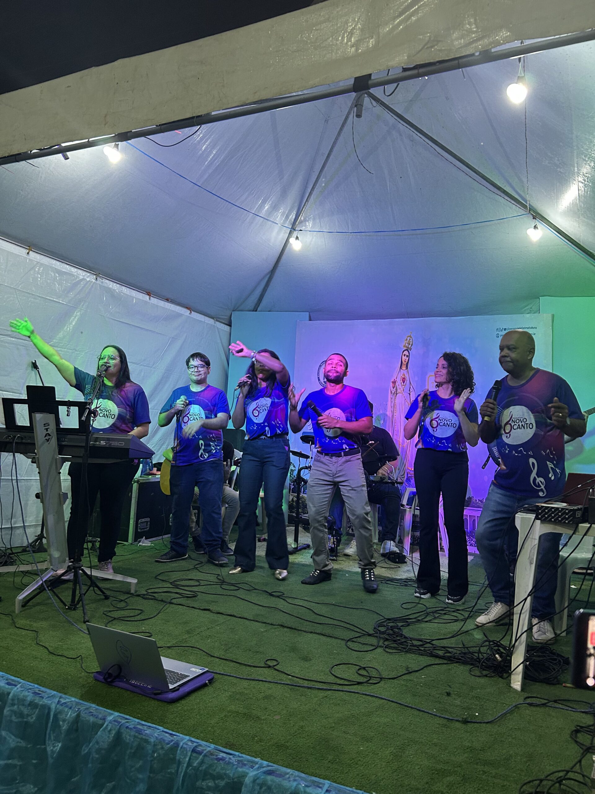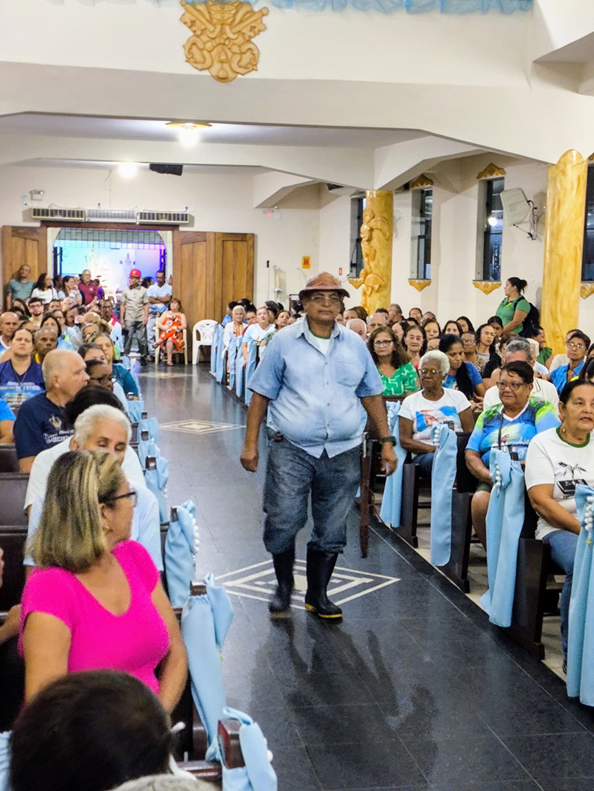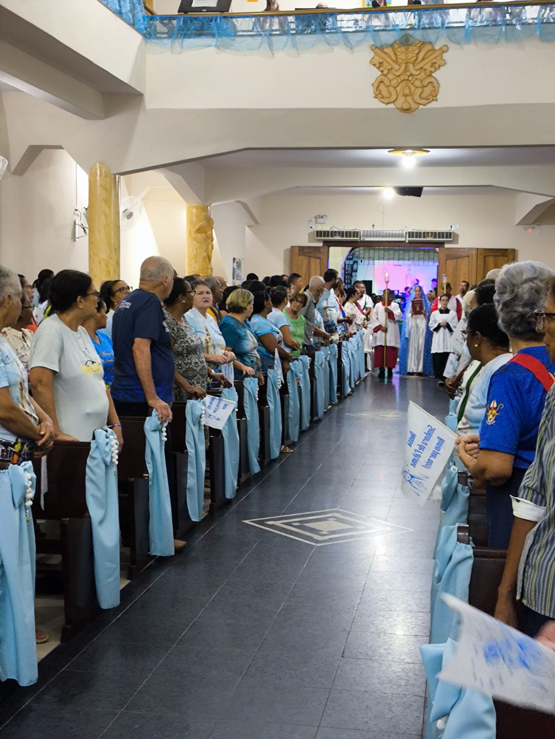 O Momento Devocional “Rezando com Maria” foi particularmente tocante, com a oração específica da noite: “Ó Maria, Mãe divina e fonte de bondade, pedimos que inspire em nós um espírito de compaixão e cuidado para com os doentes… e que sejamos sinais de esperança para os enfermos, levando-lhes conforto, carinho e a certeza de que não estão sozinhos.”. A Ladainha de Nossa Senhora foi rezada com fervor, unindo a comunidade em intercessão.