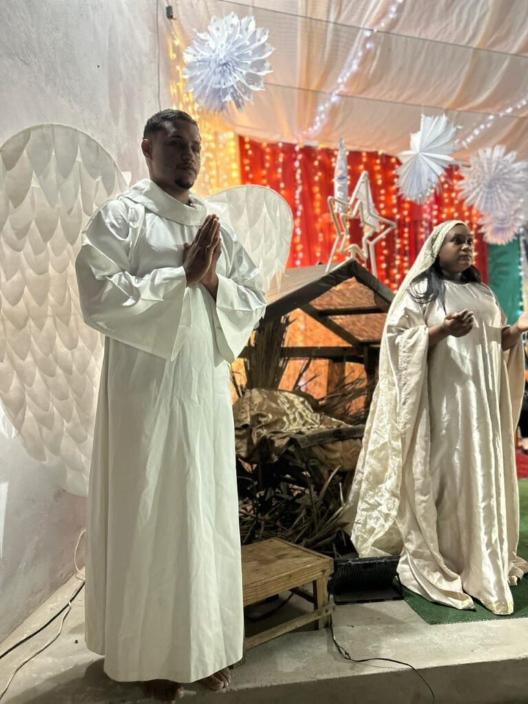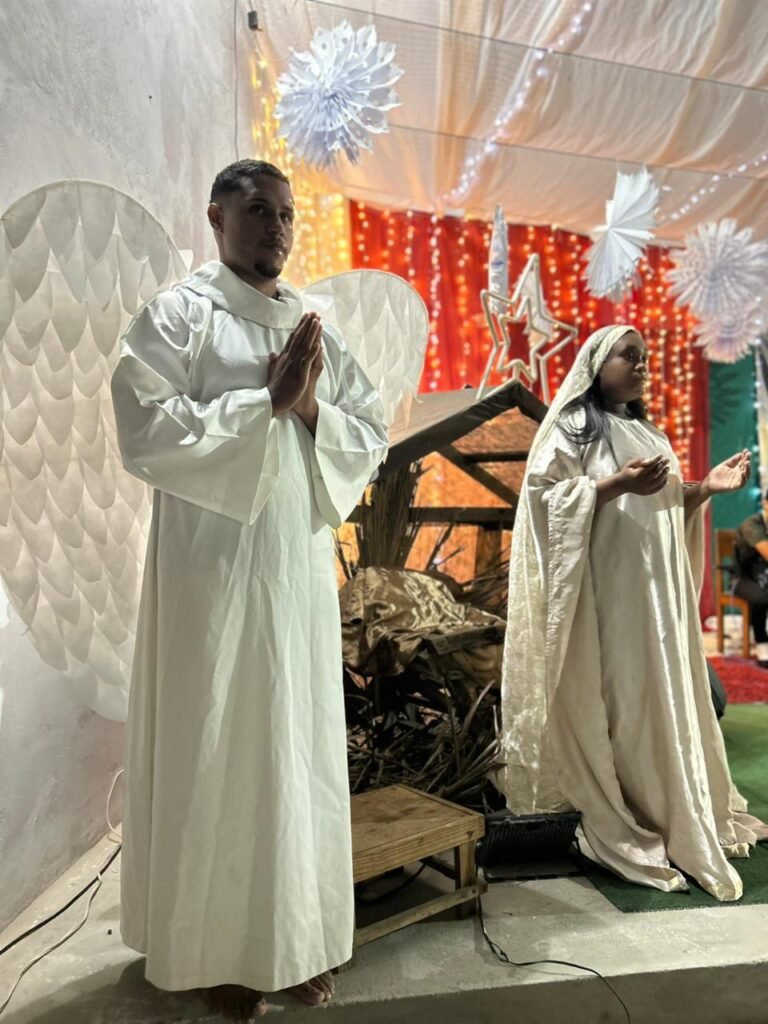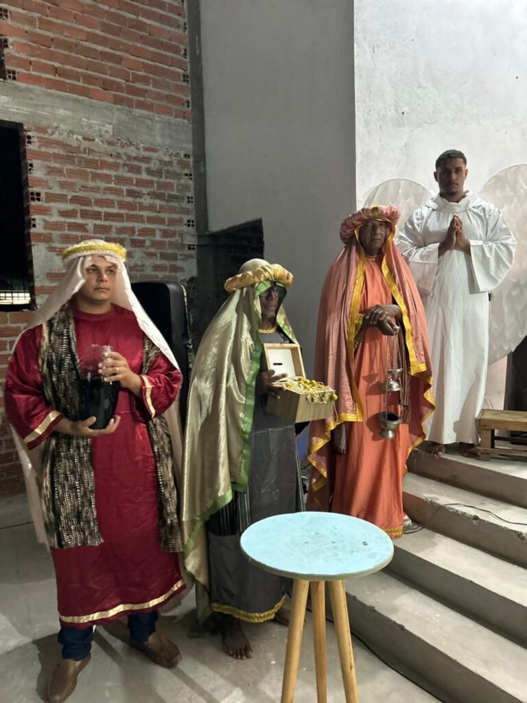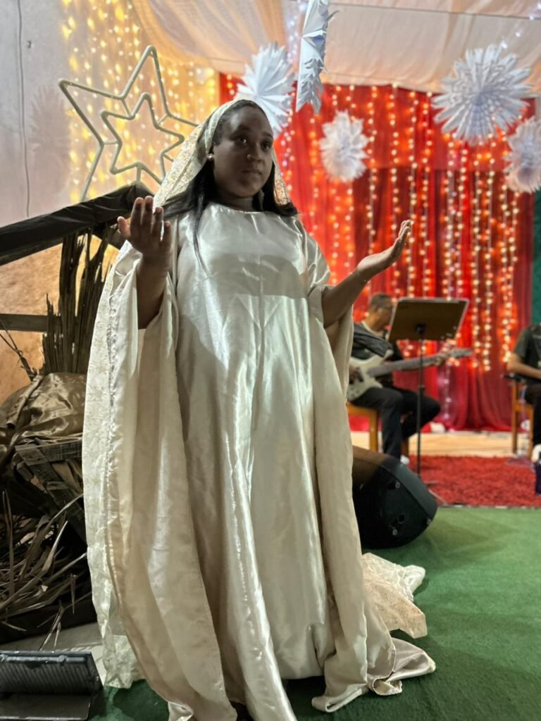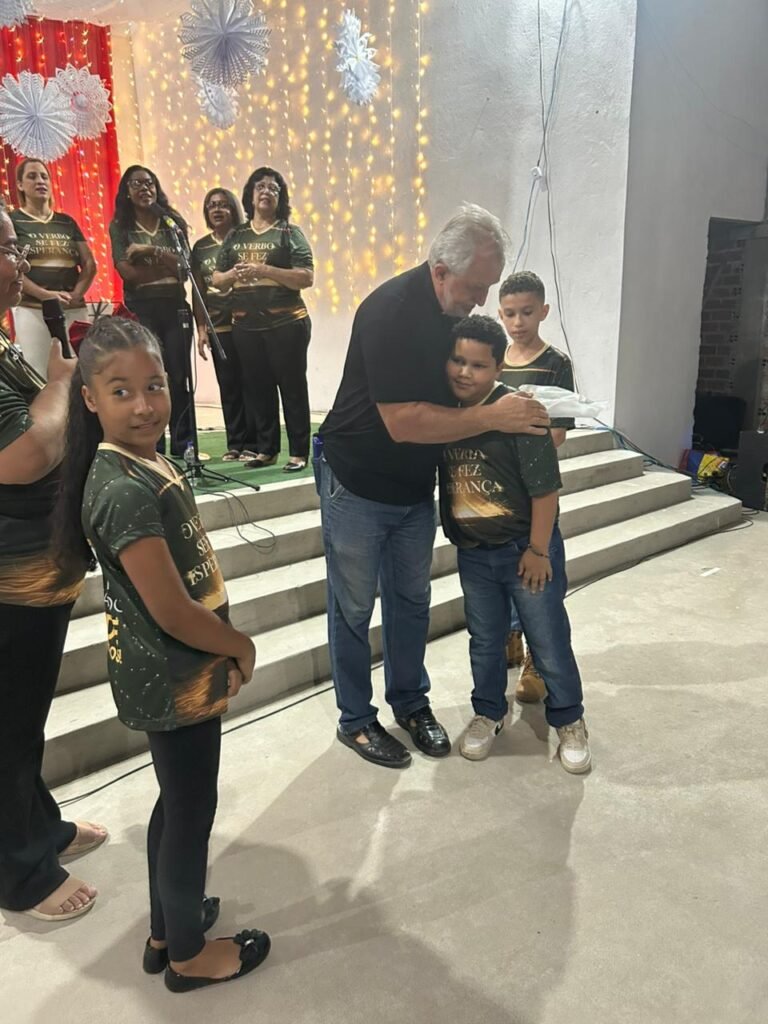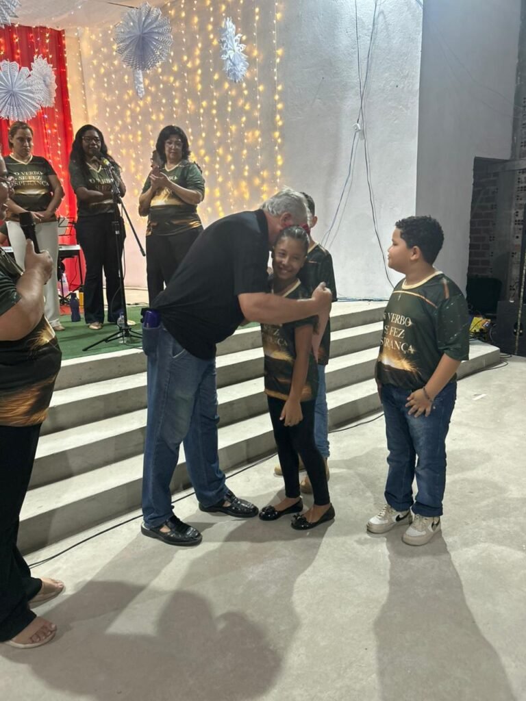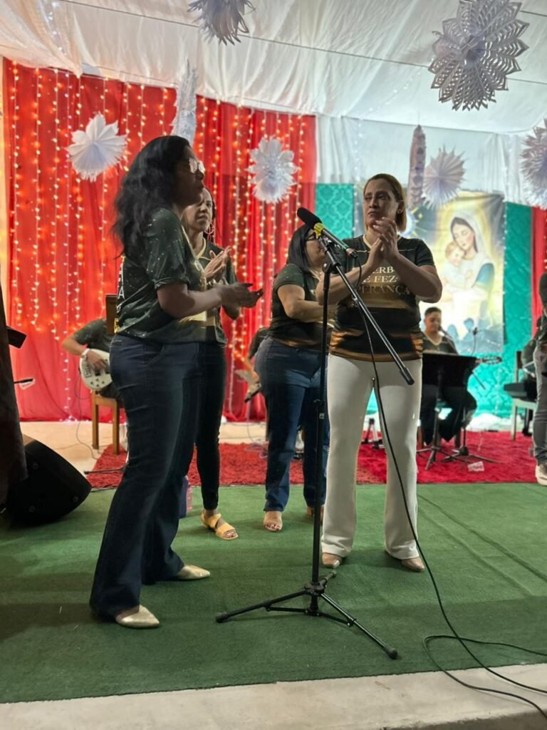 O ponto alto da noite, que tocou profundamente a todos, foi a encenação do presépio vivo. O “Sim” de Maria, proclamado com doçura e firmeza, abriu o caminho para que a Sagrada Família adentrasse o ambiente ao som de cânticos que celebravam o nascimento. A imagem de Maria e José com o Menino Jesus nos braços foi a tradução visual do tema da noite: o Verbo Divino que se faz pequeno, se faz um de nós, se faz nossa Eterna Esperança.