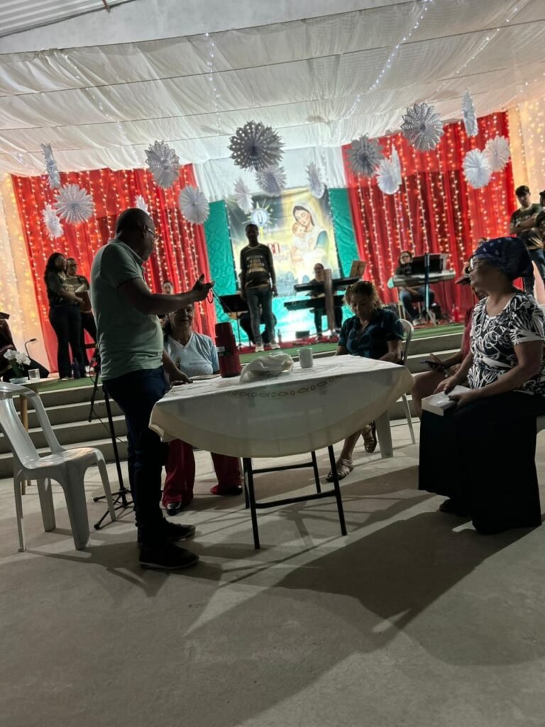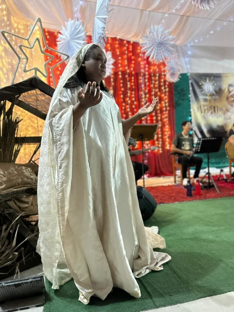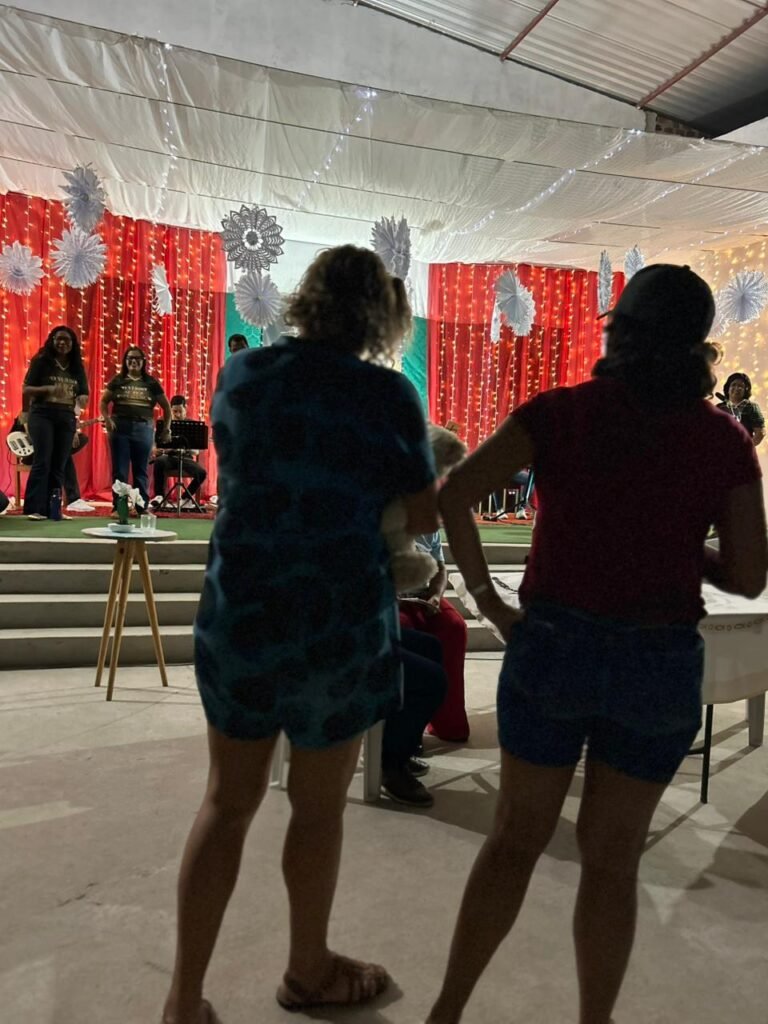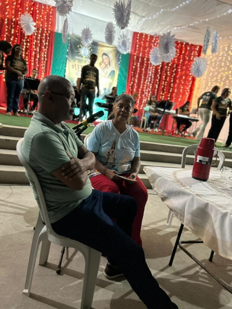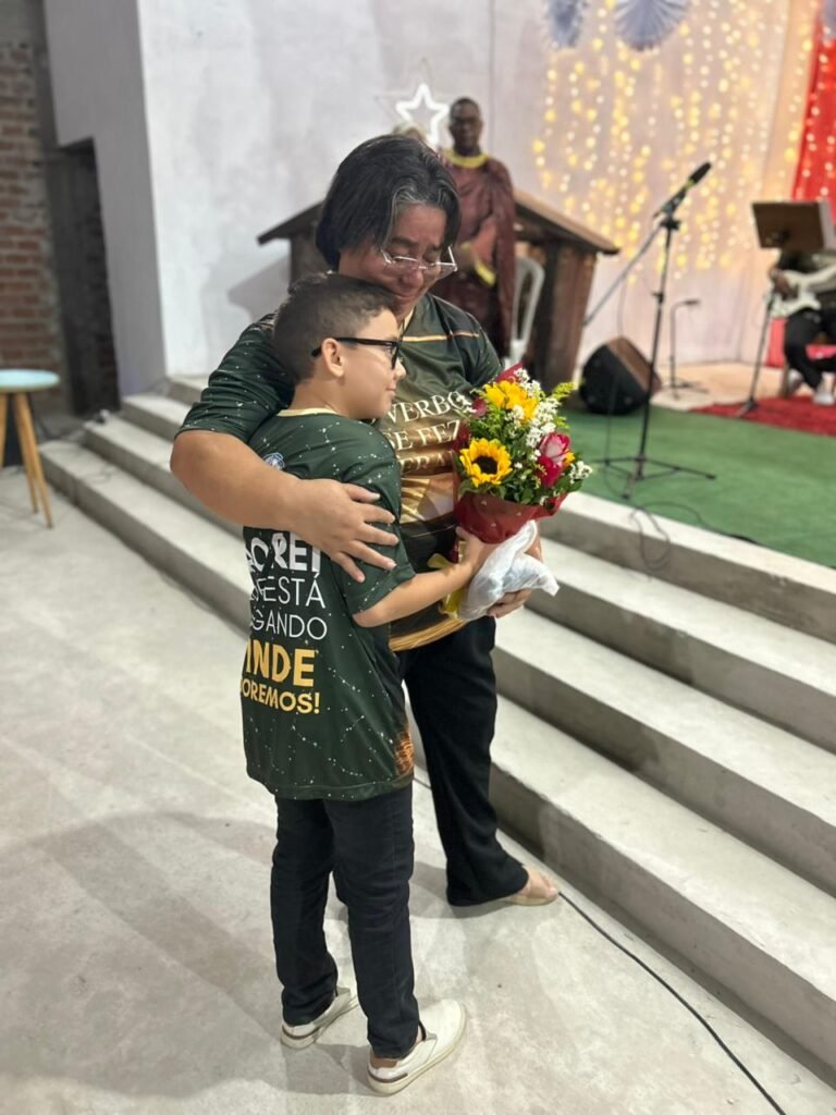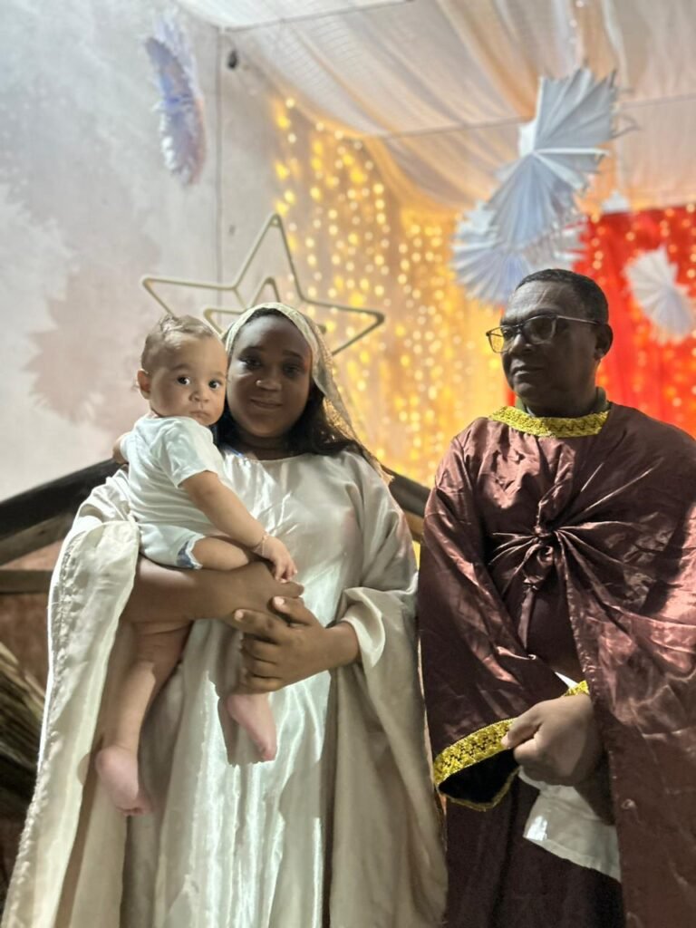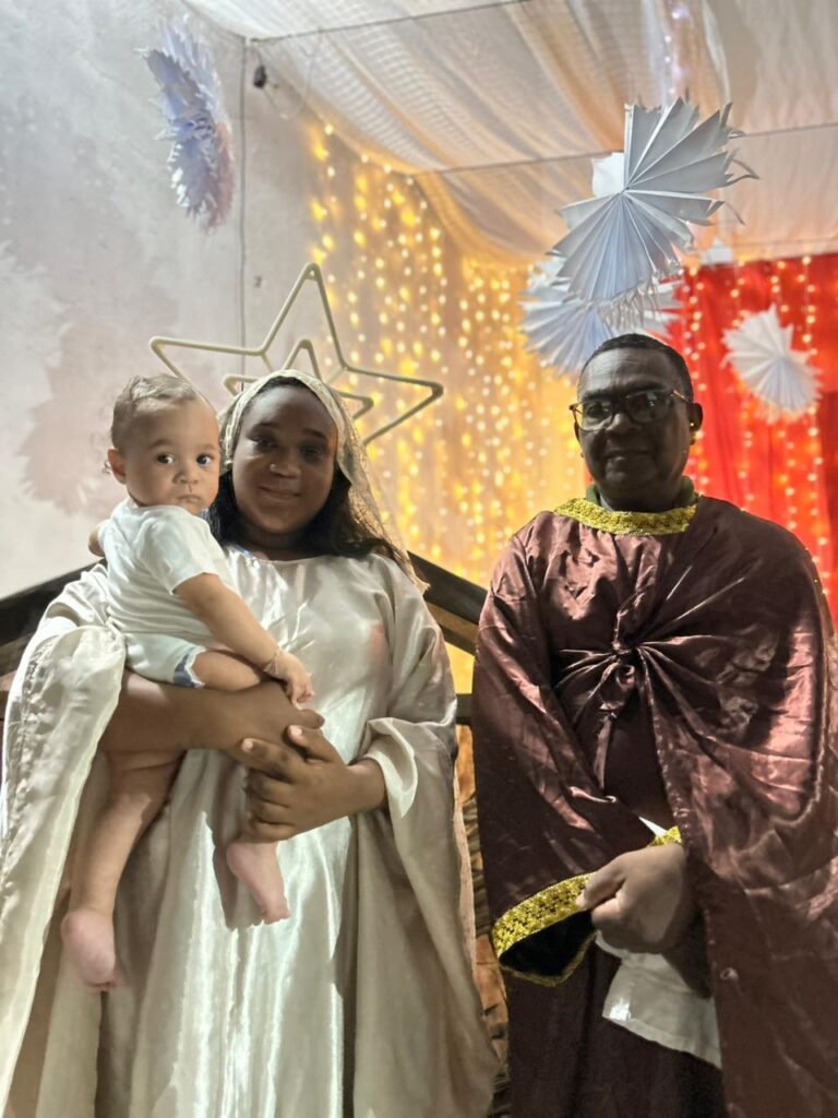 O ponto alto da noite, que tocou profundamente a todos, foi a encenação do presépio vivo. O “Sim” de Maria, proclamado com doçura e firmeza, abriu o caminho para que a Sagrada Família adentrasse o ambiente ao som de cânticos que celebravam o nascimento. A imagem de Maria e José com o Menino Jesus nos braços foi a tradução visual do tema da noite: o Verbo Divino que se faz pequeno, se faz um de nós, se faz nossa Eterna Esperança.