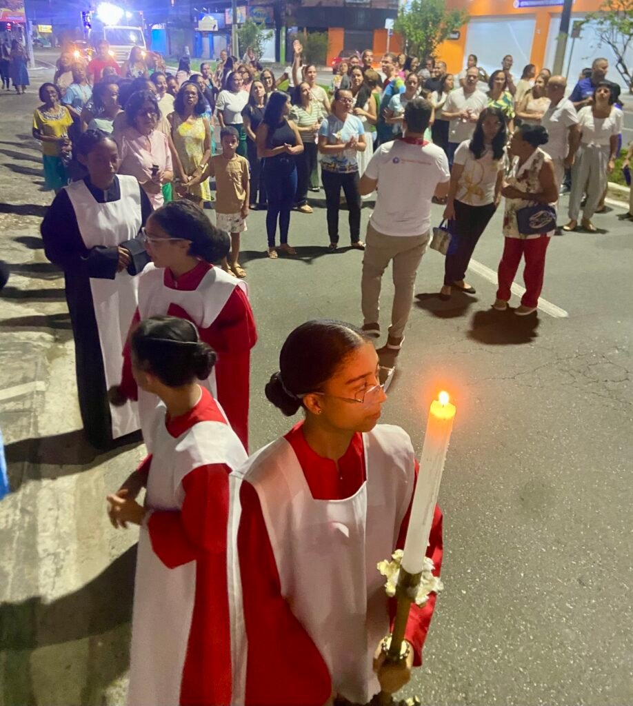 Encerrada a Liturgia Eucarística, a comunidade paroquial, inflamada pela chama do Círio Pascal, seguiu em procissão pelas ruas do Bairro de Fátima. O silêncio da quaresma deu lugar aos brados de louvor: “Jesus Ressuscitou!”.