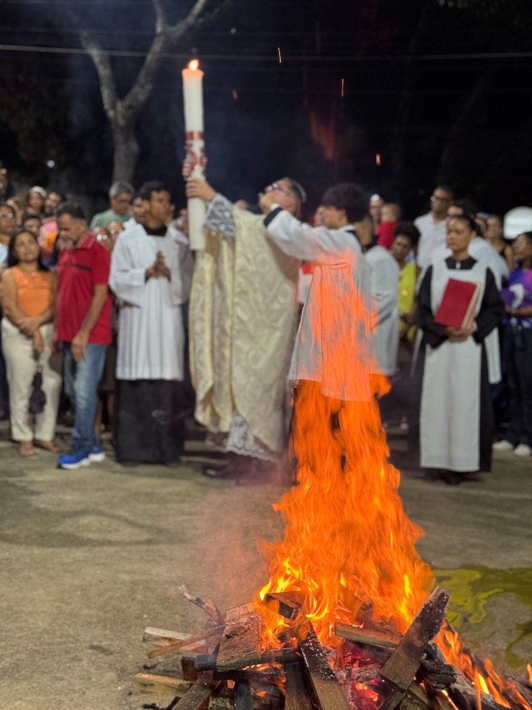 Um registro detalhado da celebração da Vigília Pascal na Paróquia Nossa Senhora de Fátima, destacando
