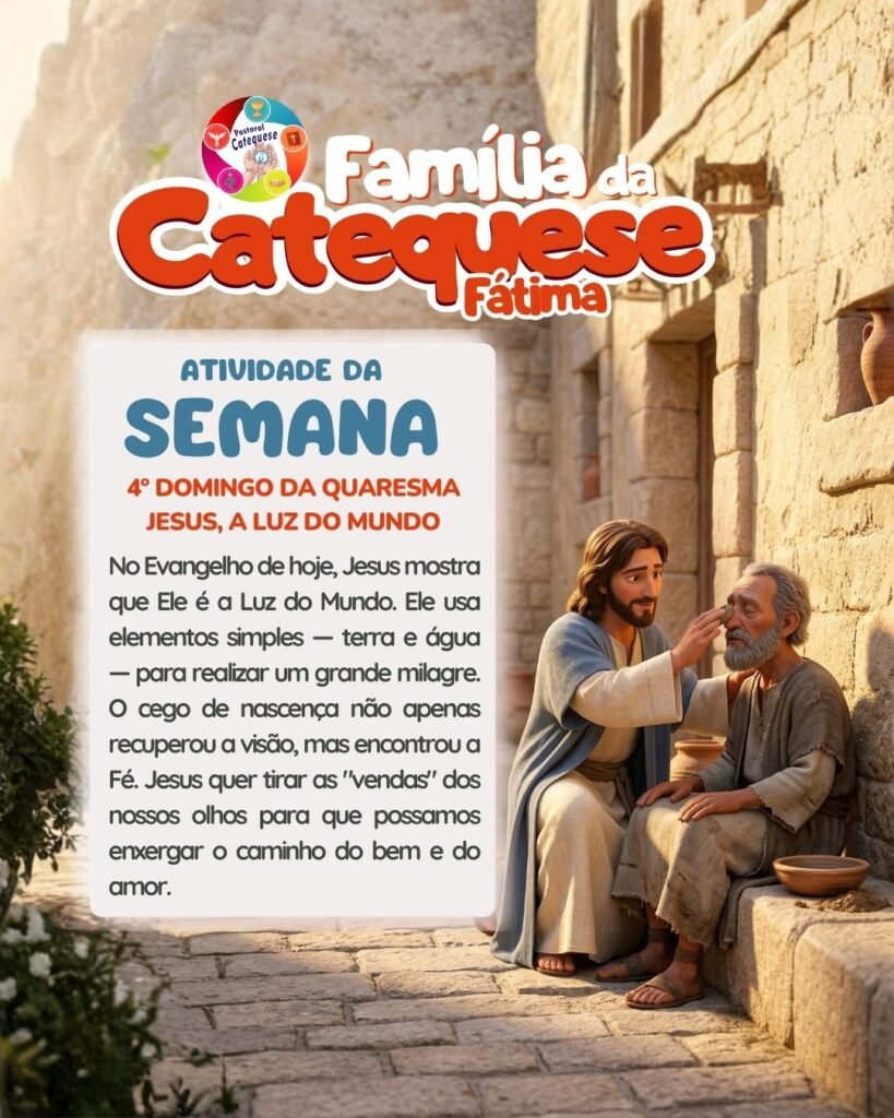 Jesus encontrou um homem que era cego desde o nascimento. Ele fez um pouco de lama, colocou nos olhos do homem e disse: “Vá lavar-se no poço de Siloé”. O homem obedeceu, lavou-se e voltou enxergando! Mais do que ver as cores, ele passou a enxergar com o coração e acreditou em Jesus. Como nos ensina o Catecismo (CIC 158), a fé é a luz que nos permite ver as coisas como Deus as vê.