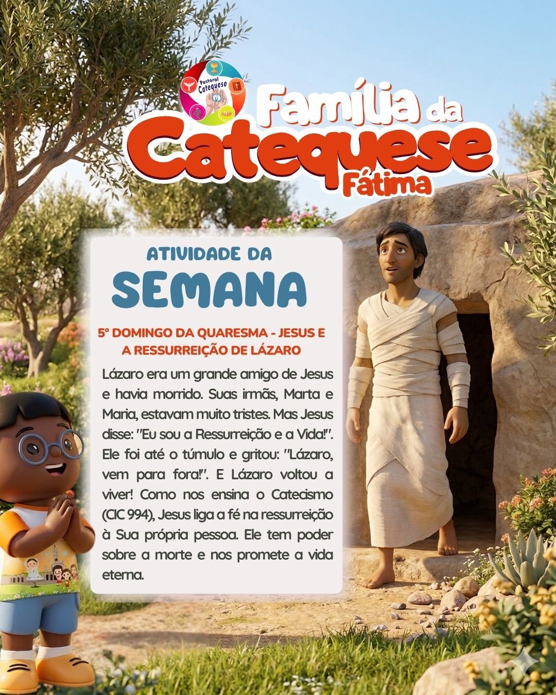 Lázaro era um grande amigo de Jesus e havia morrido. Suas irmãs, Marta e Maria, estavam muito tristes. Mas Jesus disse: “Eu sou a Ressurreição e a Vida!”. Ele foi até o túmulo e gritou: “Lázaro, vem para fora!”. E Lázaro voltou a viver! Como nos ensina o Catecismo (CIC 994), Jesus liga a fé na ressurreição à Sua própria pessoa. Ele tem poder sobre a morte e nos promete a vida eterna.
