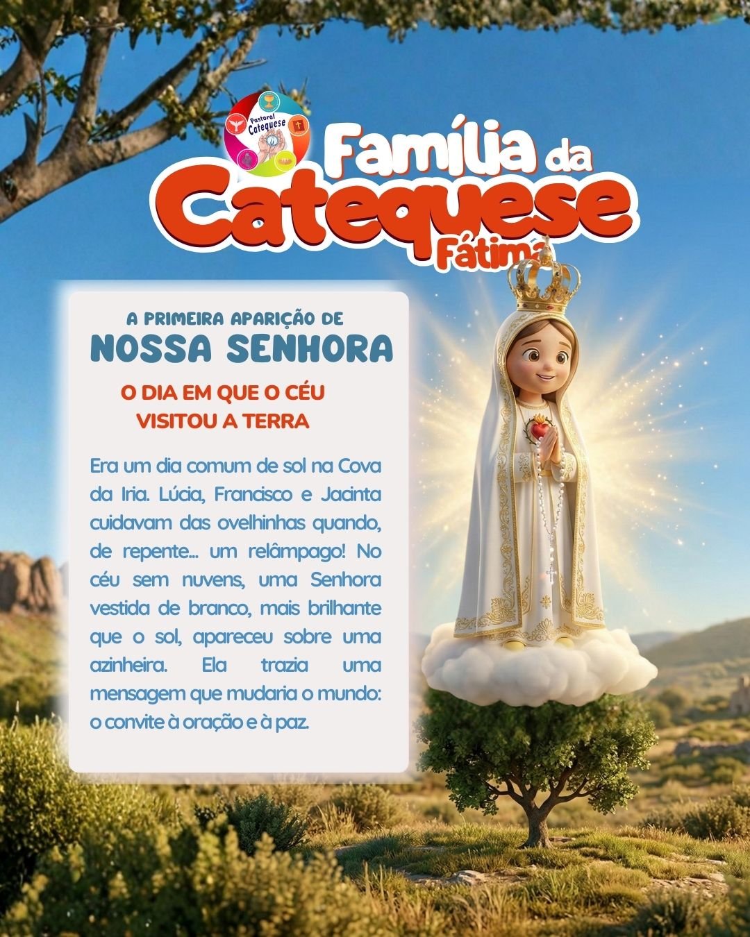Era um dia comum de sol na Cova da Iria. Lúcia, Francisco e Jacinta cuidavam das ovelhinhas quando, de repente… um relâmpago! No céu sem nuvens, uma Senhora vestida de branco, mais brilhante que o sol, apareceu sobre uma azinheira. Ela trazia uma mensagem que mudaria o mundo: o convite à oração e à paz.