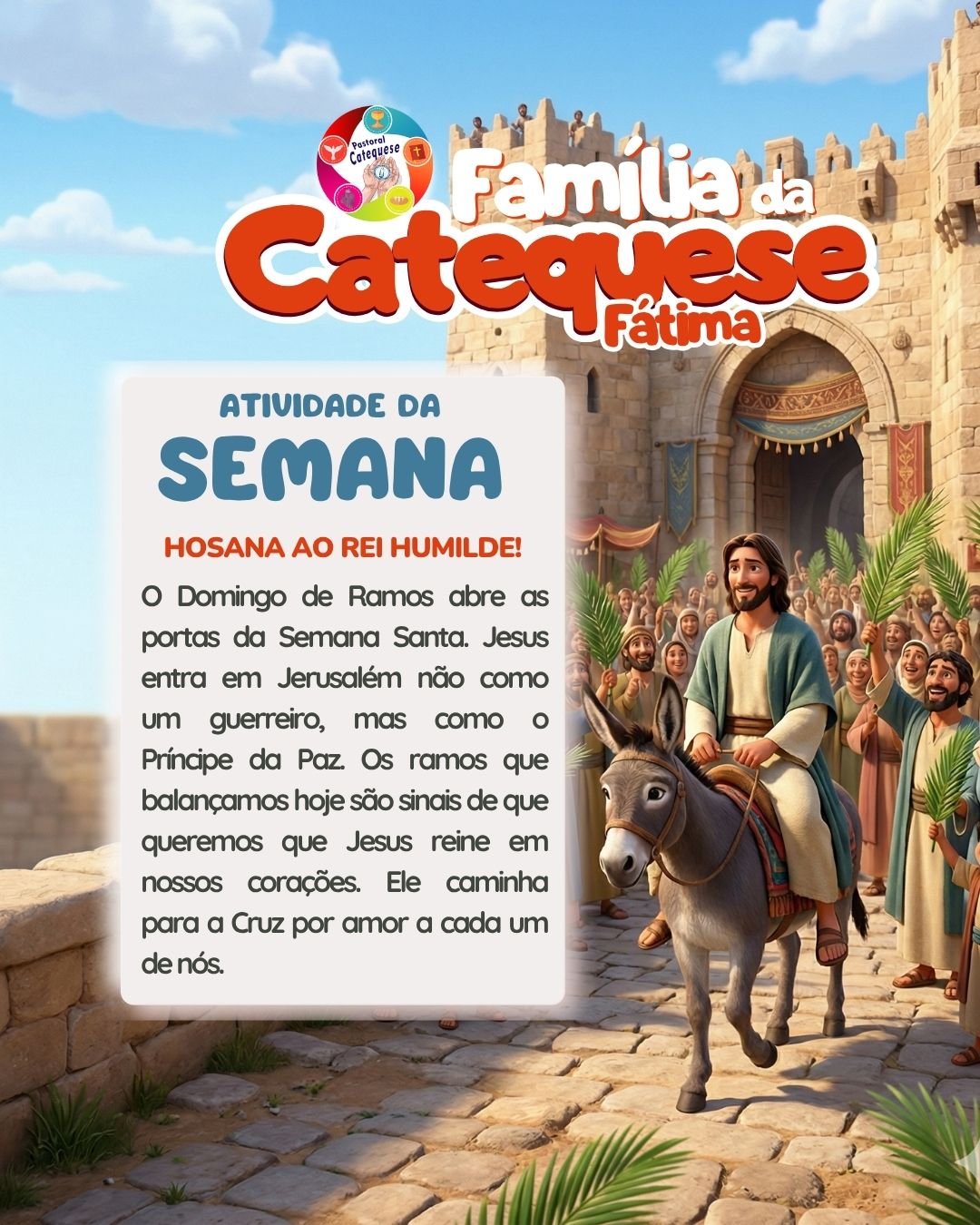 Hoje iniciamos a Grande Semana! Jesus entra em Jerusalém como um Rei humilde, montado em um jumentinho. O povo o acolhe com ramos e gritos de alegria: “Hosana ao Filho de Davi!”. Mas essa mesma multidão, dias depois, o verá carregar a Cruz. O Domingo de Ramos é o portal da Semana Santa, onde aprendemos que o amor de Jesus é maior que qualquer dor. Como nos ensina o Catecismo (CIC 559), a entrada de Jesus em Jerusalém manifesta a vinda do Reino que o Rei-Messias vai realizar pela Páscoa de sua Morte e Ressurreição.