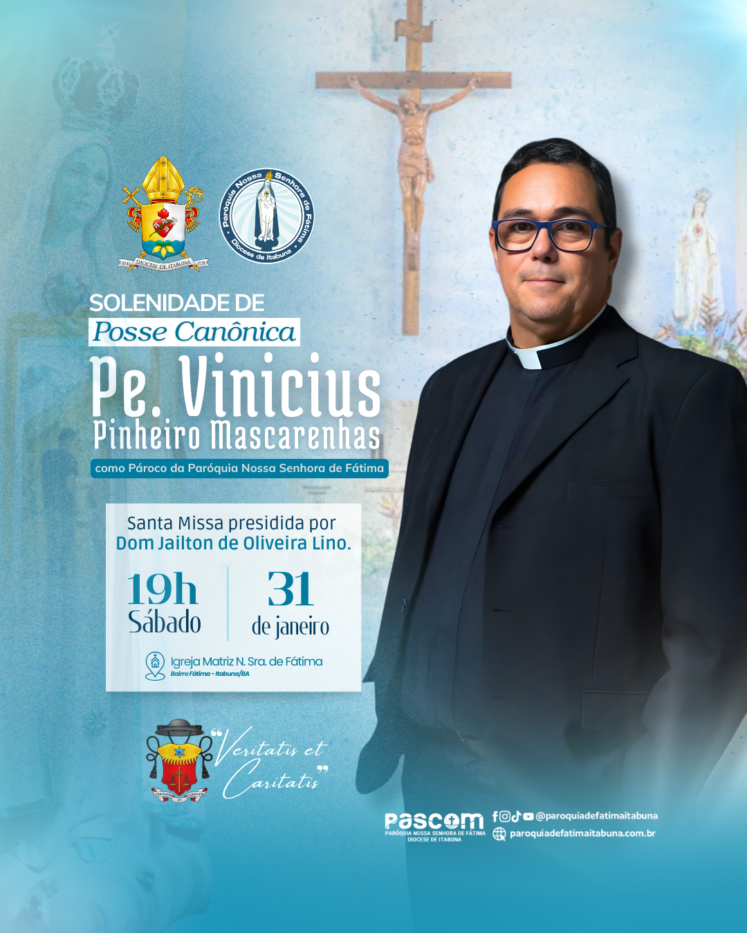 A Diocese de Itabuna e a Paróquia Nossa Senhora de Fátima vivem um momento de profunda renovação e alegria. Neste sábado, 31 de janeiro, às 19h, a comunidade se reunirá na Igreja Matriz para a Solenidade de Posse Canônica de seu novo pároco, o Reverendíssimo Padre Vinicius Pinheiro Mascarenhas.