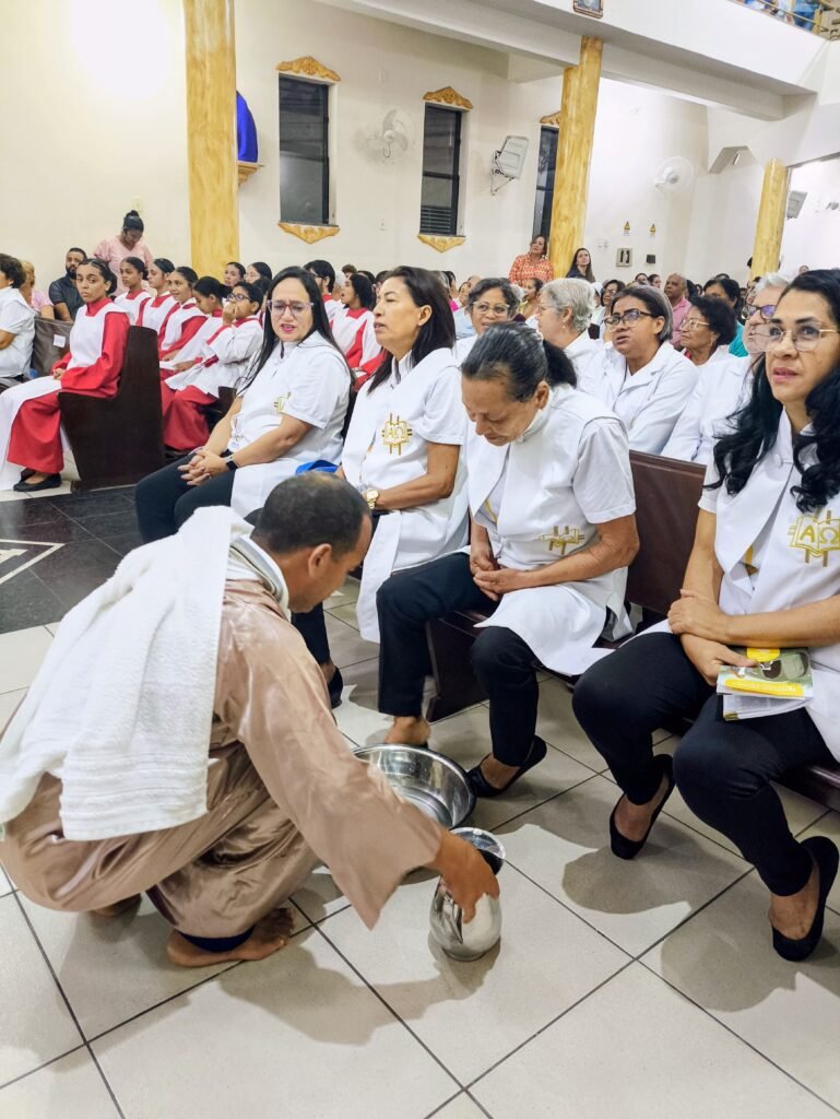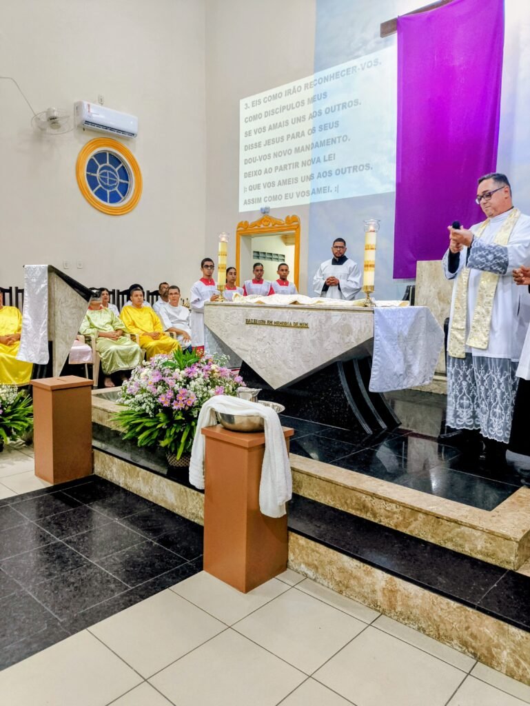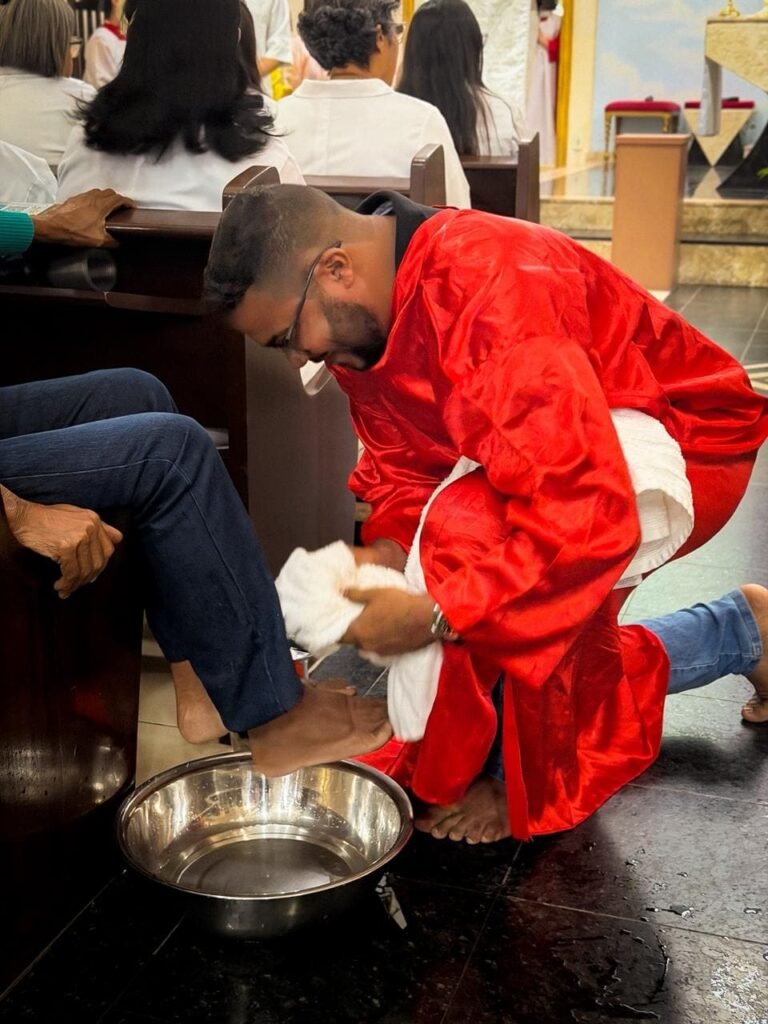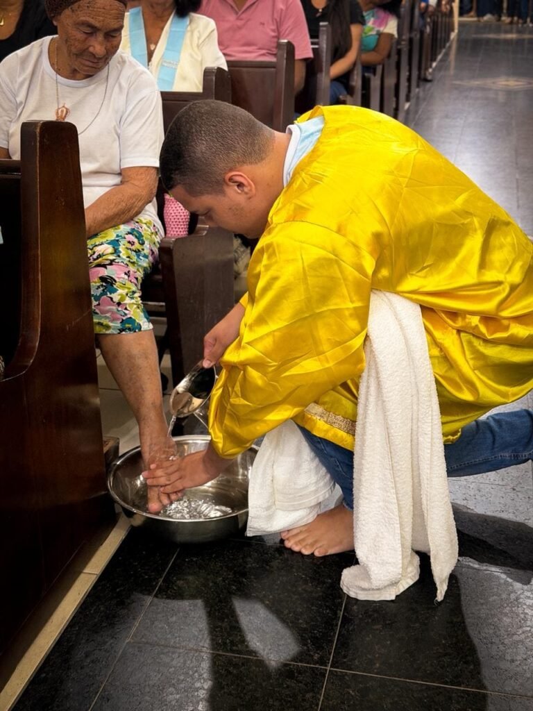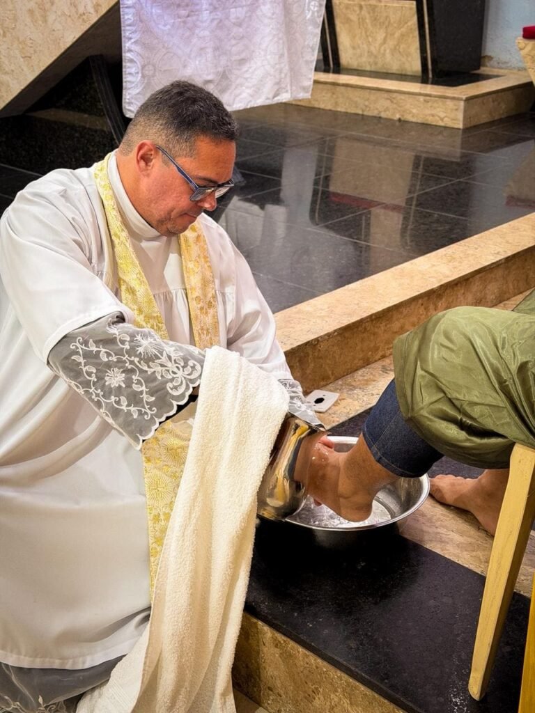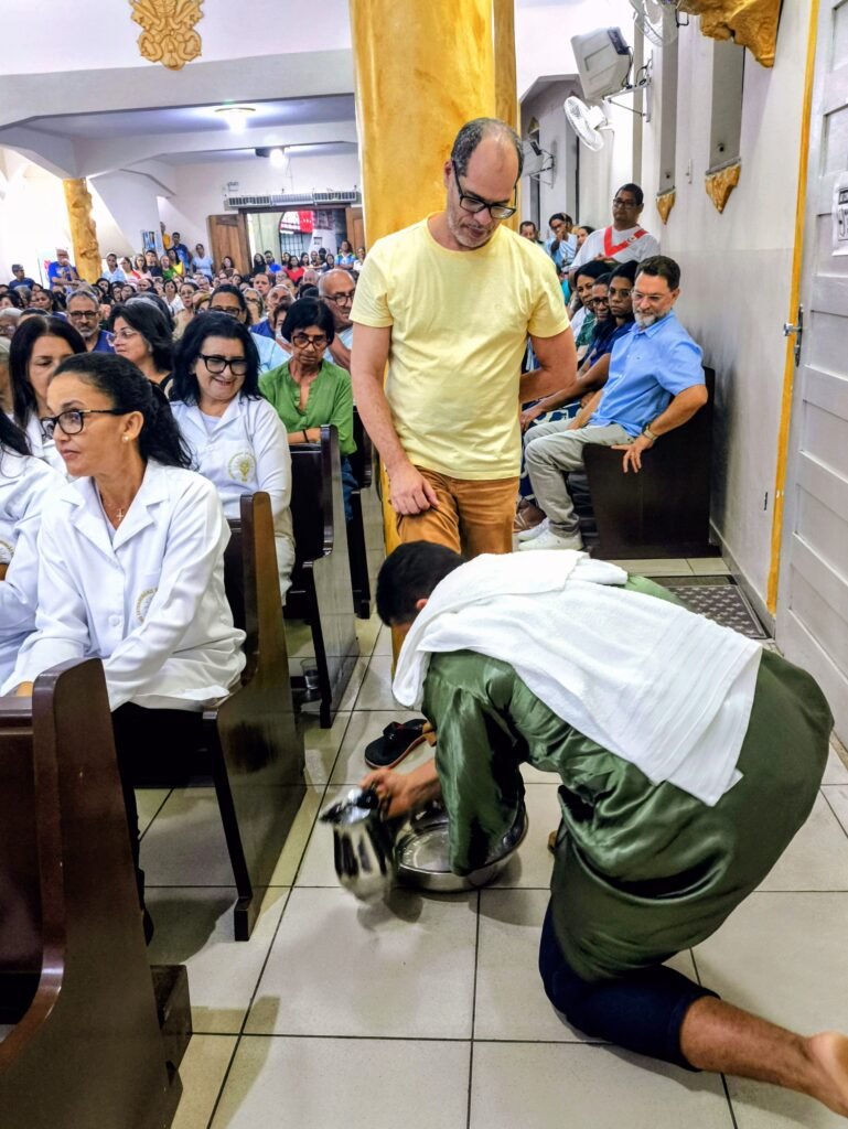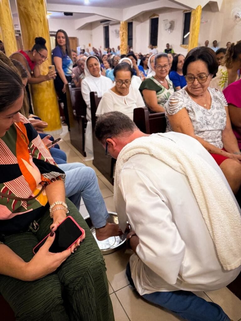 Porém, a grande surpresa litúrgica veio logo a seguir. Para ilustrar que o serviço não deve ficar restrito ao presbitério, o pároco enviou os 12 representantes até a assembleia, pedindo que cada um escolhesse uma pessoa nos bancos para também lavar os seus pés. A dinâmica comoveu a todos, materializando a exortação do padre: “Nós temos que reproduzir o gesto de Jesus no nosso próximo”. O gesto foi um apelo direto para que a paróquia vença o “egoísmo pastoral”, abrindo sempre espaço para acolher novos irmãos no serviço.