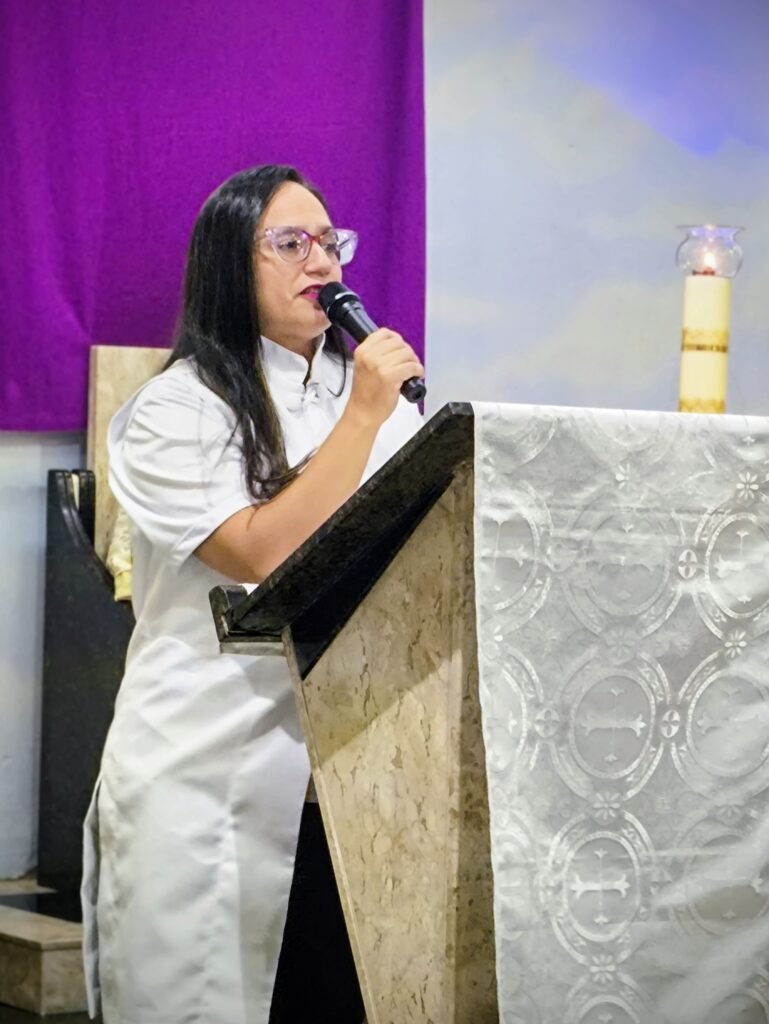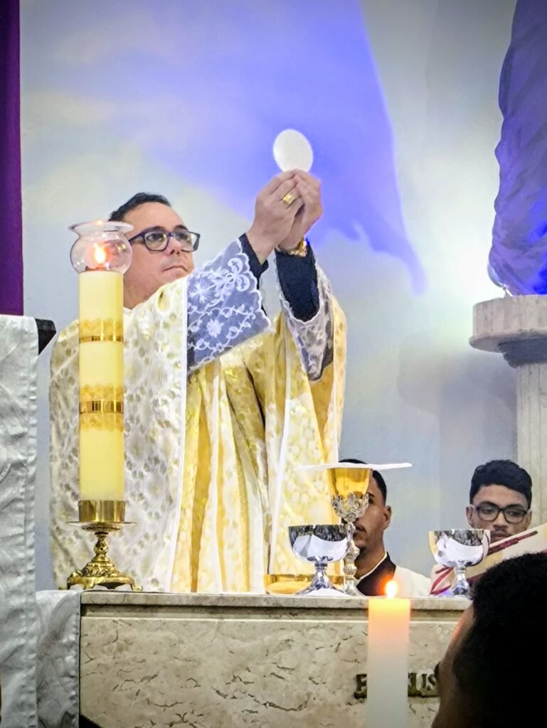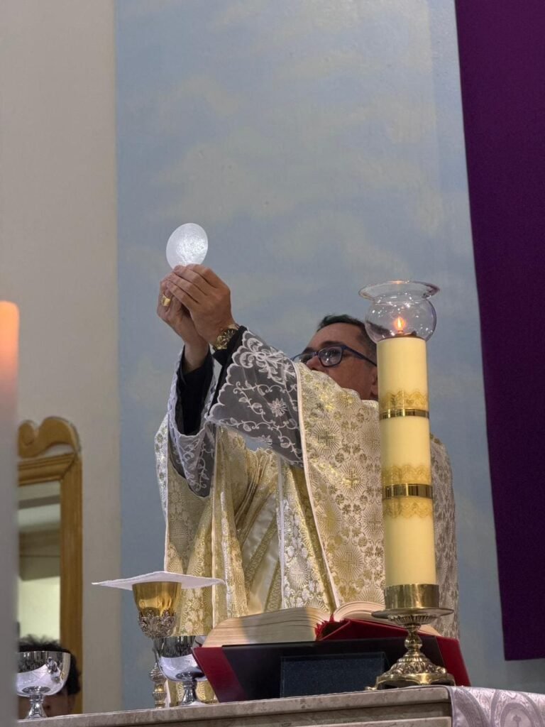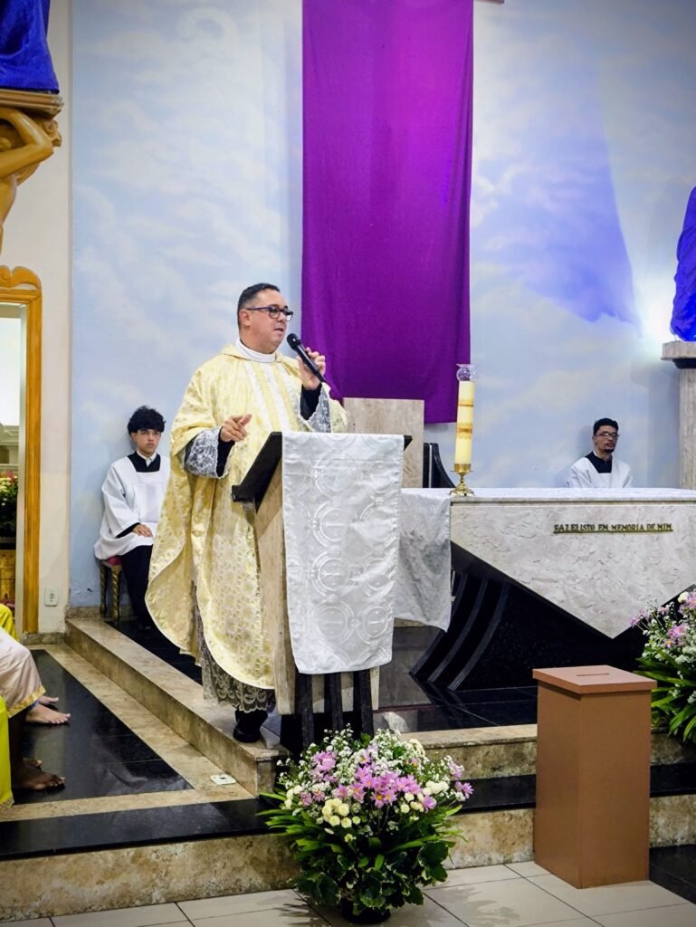 A celebração teve início com uma Liturgia da Palavra atenta e fervorosa. Em sua homilia, Pe. Vinicius destacou a riqueza das leituras que narram desde a Páscoa judaica até a tradição eucarística ensinada por São Paulo. “A gente viaja nas leituras. Memória é trazer o fato do passado para o presente, vivendo como se estivesse acontecendo agora”, explicou o pároco.