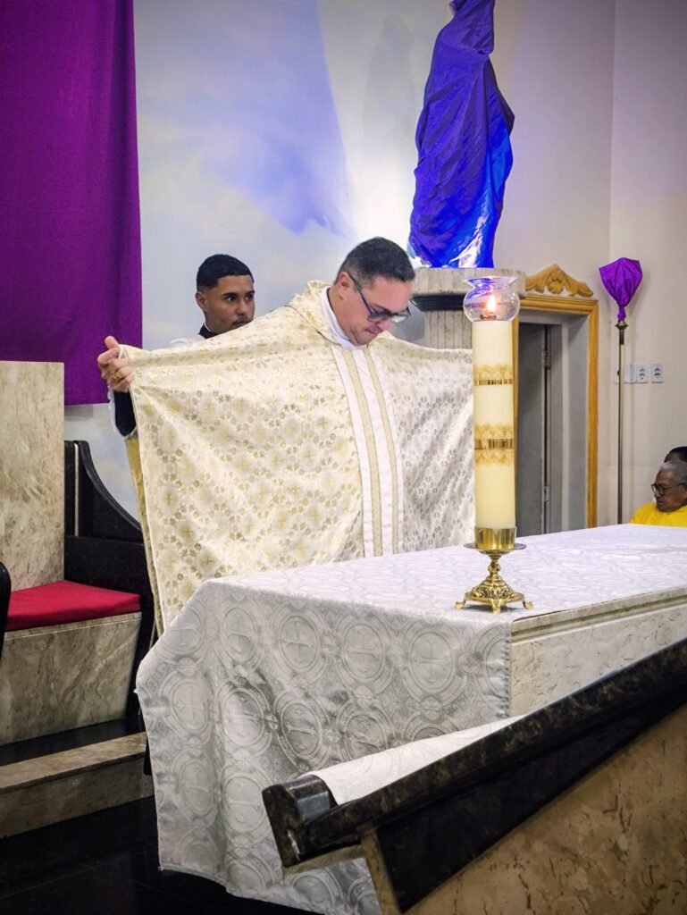 Antes de lavar os pés, Pe. Vinicius explicou o simbolismo da veste litúrgica: “A casula é uma veste de dimensão real, de realeza. O padre a retira assim como Jesus depôs o seu manto. Ele se despoja da autoridade, cinge-se com a toalha e lava os pés”.