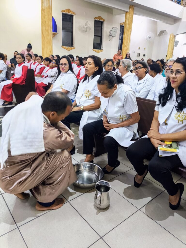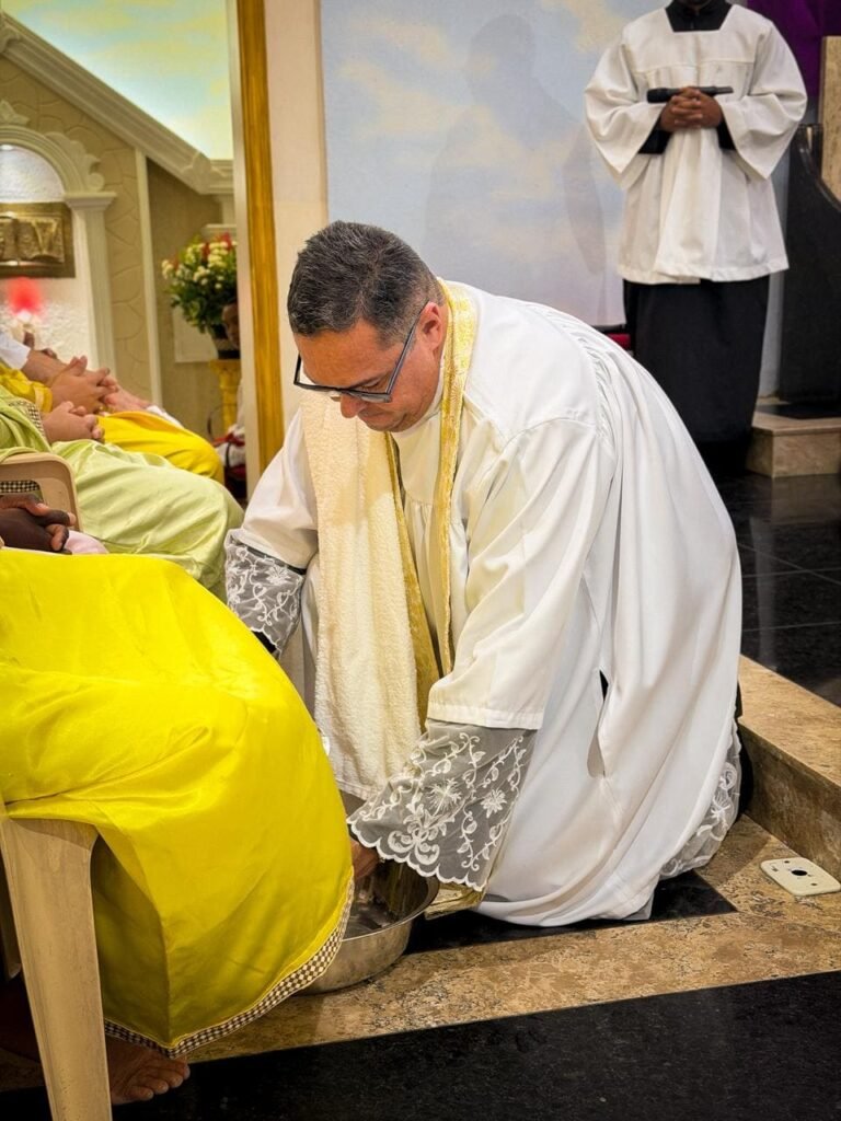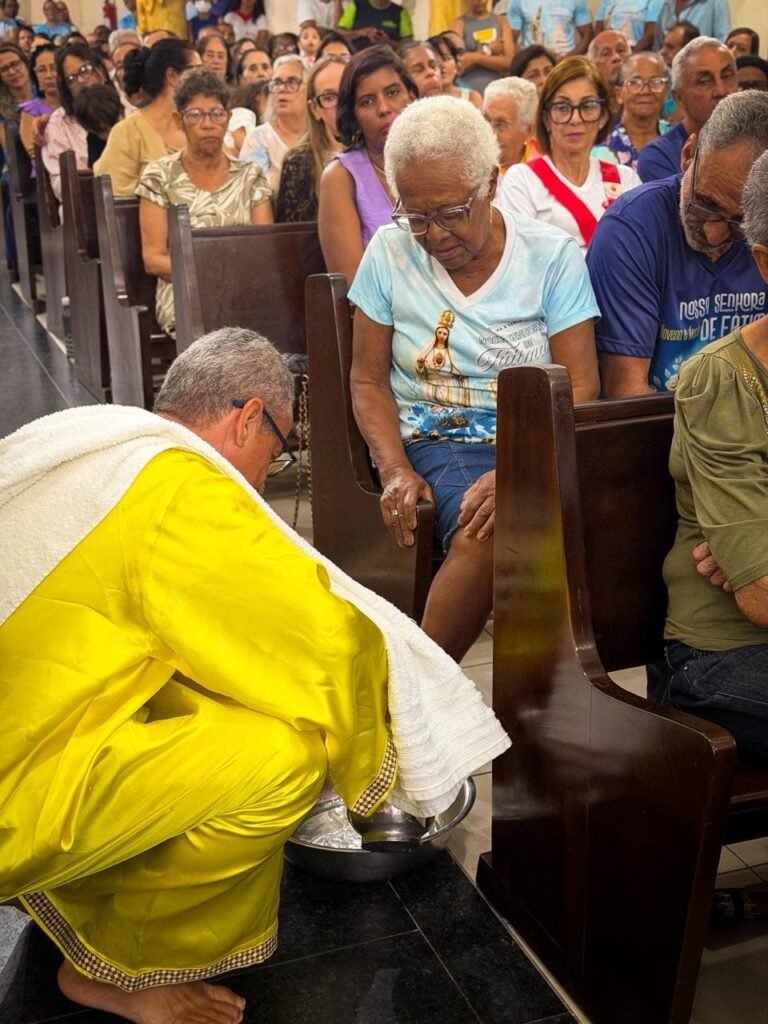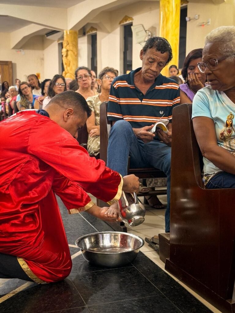 Porém, a grande surpresa litúrgica veio logo a seguir. Para ilustrar que o serviço não deve ficar restrito ao presbitério, o pároco enviou os 12 representantes até a assembleia, pedindo que cada um escolhesse uma pessoa nos bancos para também lavar os seus pés. A dinâmica comoveu a todos, materializando a exortação do padre: “Nós temos que reproduzir o gesto de Jesus no nosso próximo”. O gesto foi um apelo direto para que a paróquia vença o “egoísmo pastoral”, abrindo sempre espaço para acolher novos irmãos no serviço.
