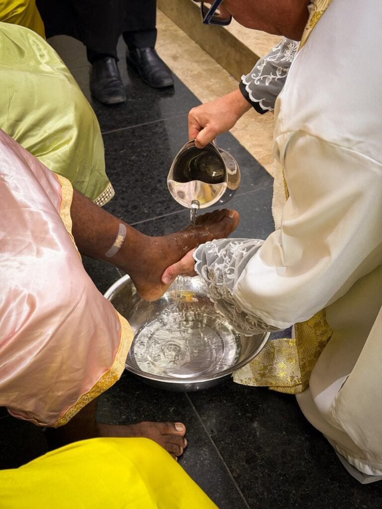 Antes de lavar os pés, Pe. Vinicius explicou o simbolismo da veste litúrgica: “A casula é uma veste de dimensão real, de realeza. O padre a retira assim como Jesus depôs o seu manto. Ele se despoja da autoridade, cinge-se com a toalha e lava os pés”.