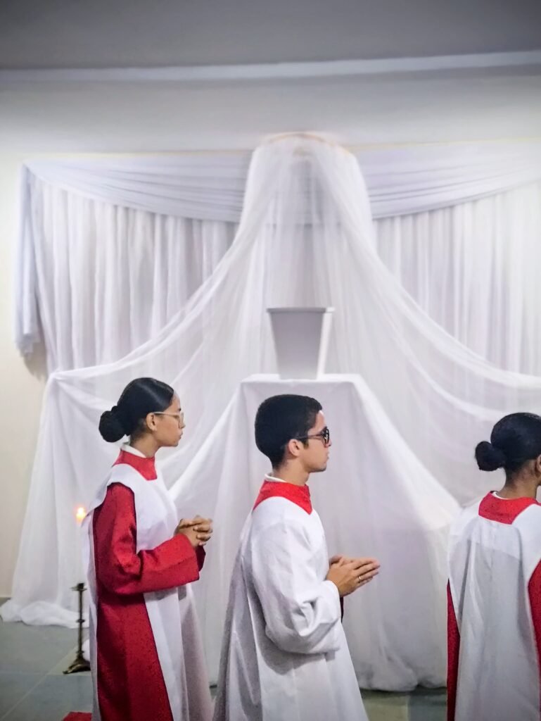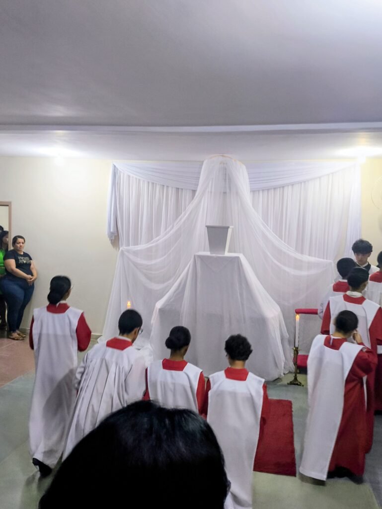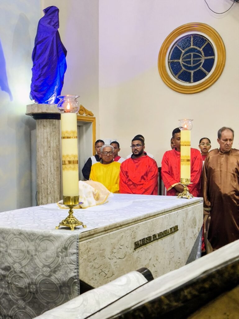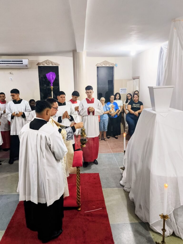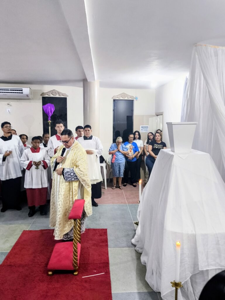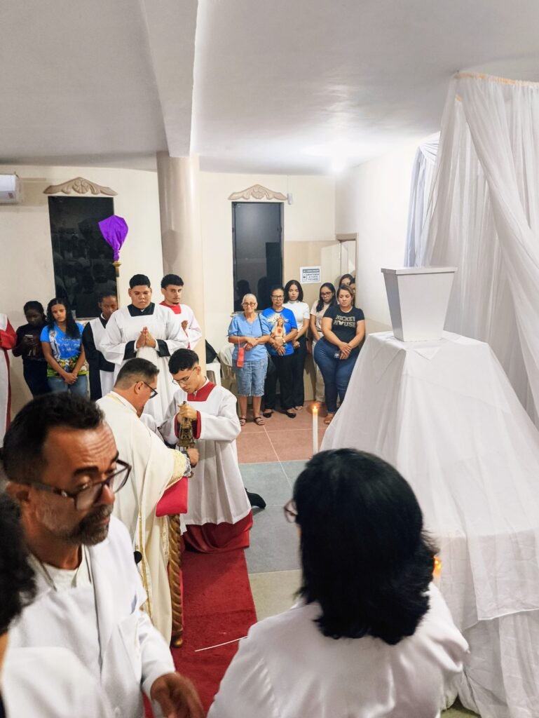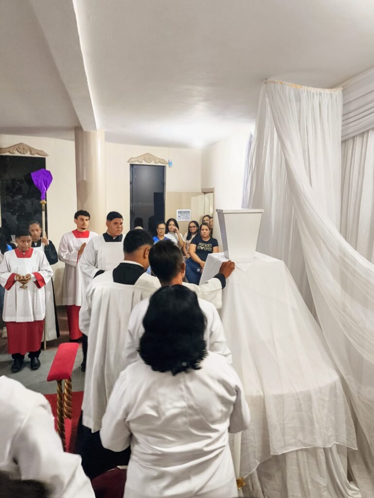 O altar-mor foi desnudado, as toalhas foram retiradas e o sacrário ficou aberto e vazio. Em procissão silenciosa e solene, o Pe. Vinicius transladou as âmbulas com o Santíssimo Sacramento até o salão paroquial, localizado no piso superior da torre, que foi belissimamente preparado como Repositório.